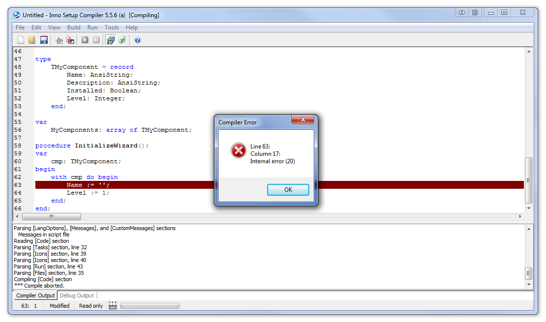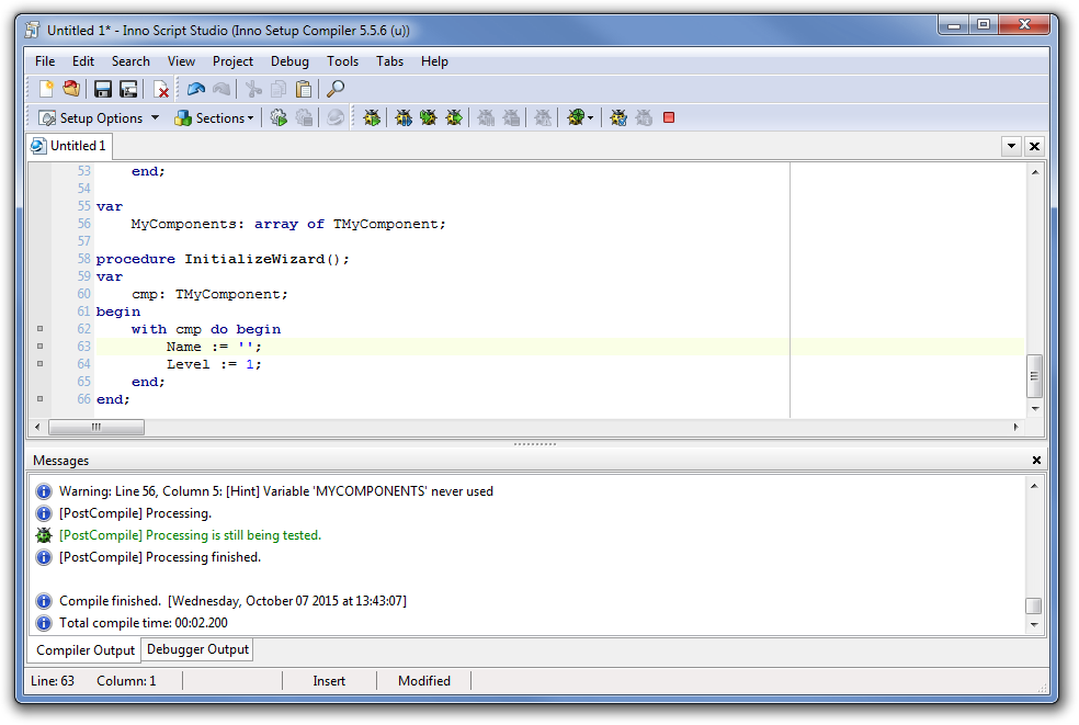 | Additional Information | Another example: [Code] type TMyComponent = record Name: String; Description: String; Installed: Boolean; Level: Integer; end; var MyComponents: array of TMyComponent; procedure InitializeWizard(); var cmp: TMyComponent; begin with cmp do begin Name := 'MyName'; Level := 1; end; end; | ||||