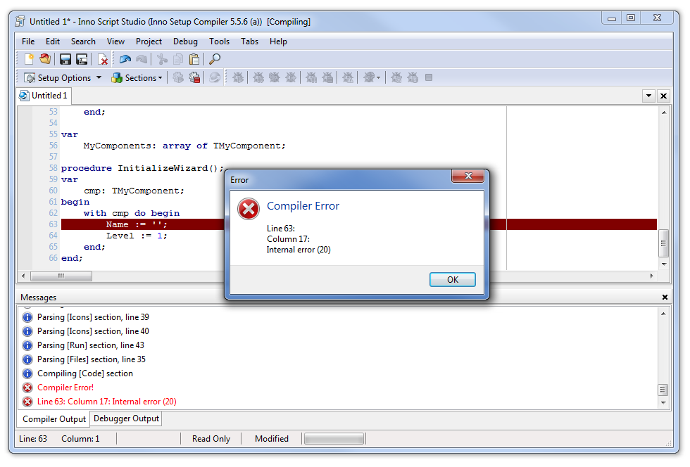 | Description | In the code section, when we use the "with" keyword on a record, Inno Script Studio displays the error message "Unknown identifier ''", in my spefic code displayed "Internal error (20)". The same code works fine on Inno Setup. | ||||