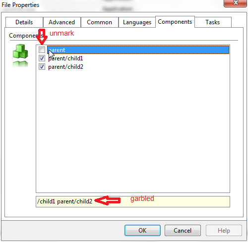 | Description | Note in the POC script attached: 1) There are three components: parent, parent/child1, parent/child2 parent/child2 has flag "checkablealone" 2) File "sourcefile1.exe" only has the two child components, but the "Components" tab also shows the "parent" component marked. 3) If you now, in the "Components" tab, unmark the "parent" component -- the script source is garbled! 4) File "file2.exe" has the "parent/child2" component marked. If you now, in the "Components" tab, also mark the "parent" component -- the script source is garbled! | ||||