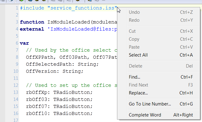 Hi Tim Sorry to say no difference with the test download. [Code] #include "service_functions.iss" Right click and choosing Open #Include File Results in nothing happening Uninstalled and reinstalled just in case it was not getting updated and same issue. But looking at the install files they are dated 3/7/2012 I would suspect them to be 5/7/2012. |